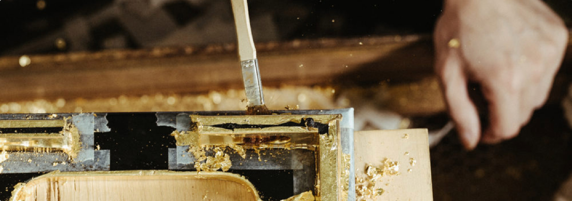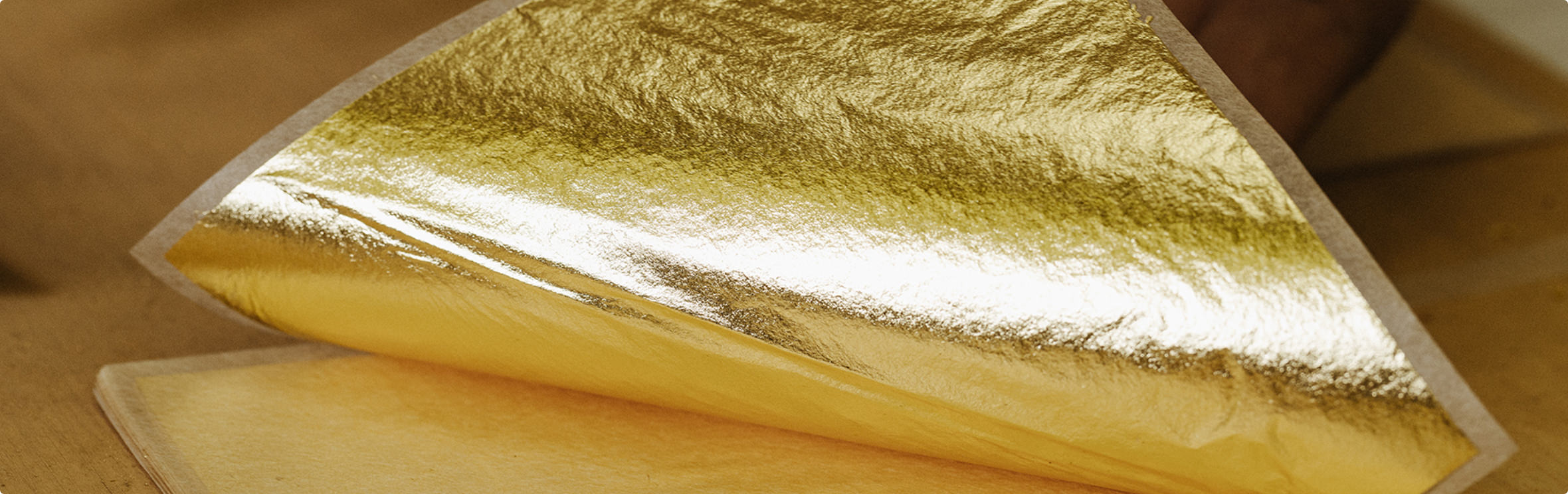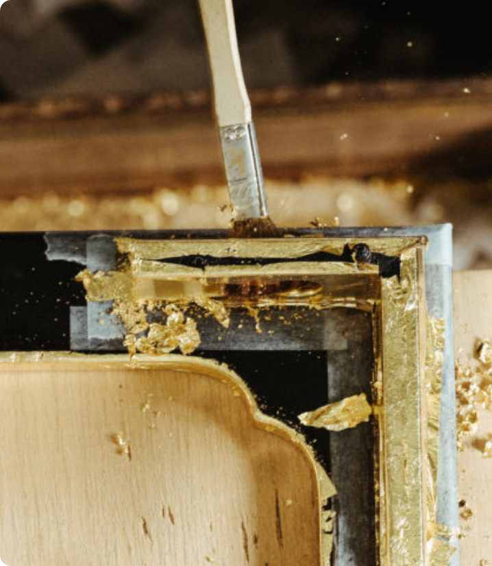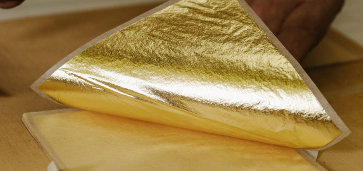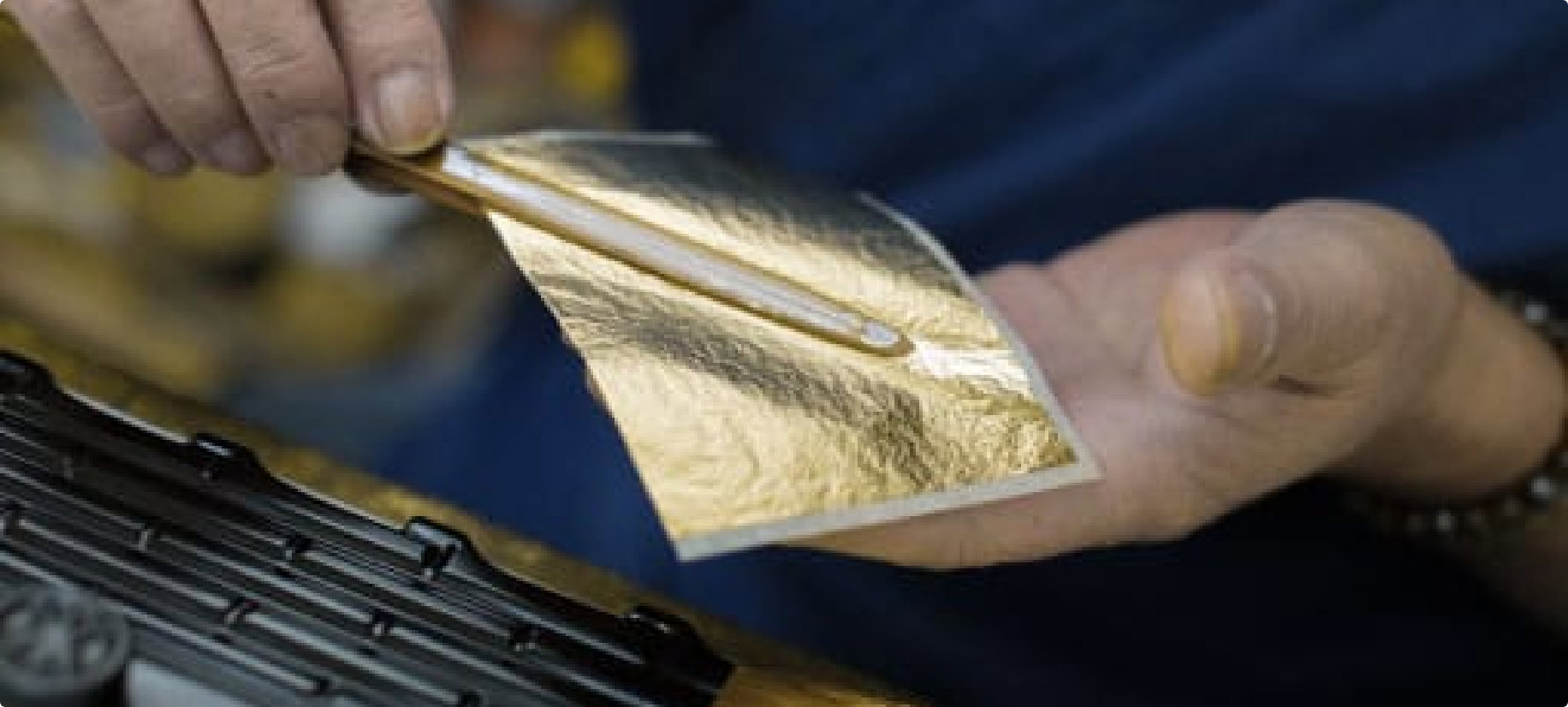 The craftsman freely manipulates the gold leaf and applies it to curved or uneven surfaces, whether flat or solid.