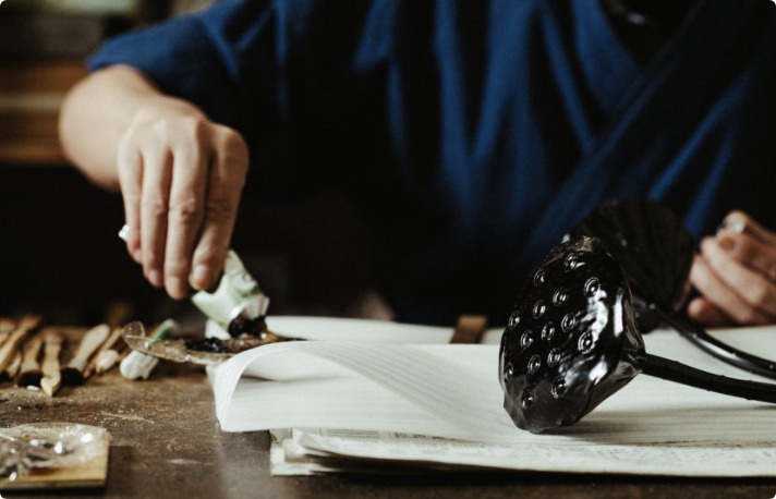 We apply gold leaf to lacquered object using urushi.