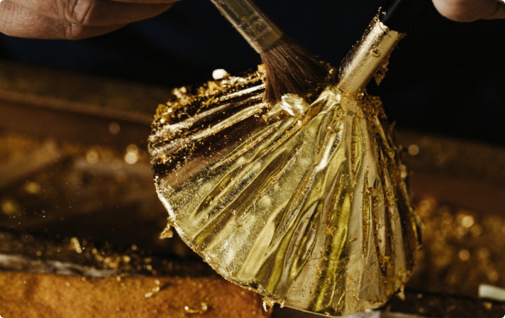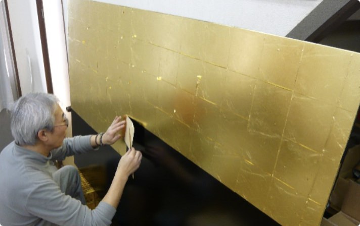 1万分の1ミリという薄さの金沢産本金箔(ユネスコ無形文化遺産)を使用します。自由自在に金箔を操り、平面、立体問わず、曲面や凹凸のある部分にも貼っていきます。